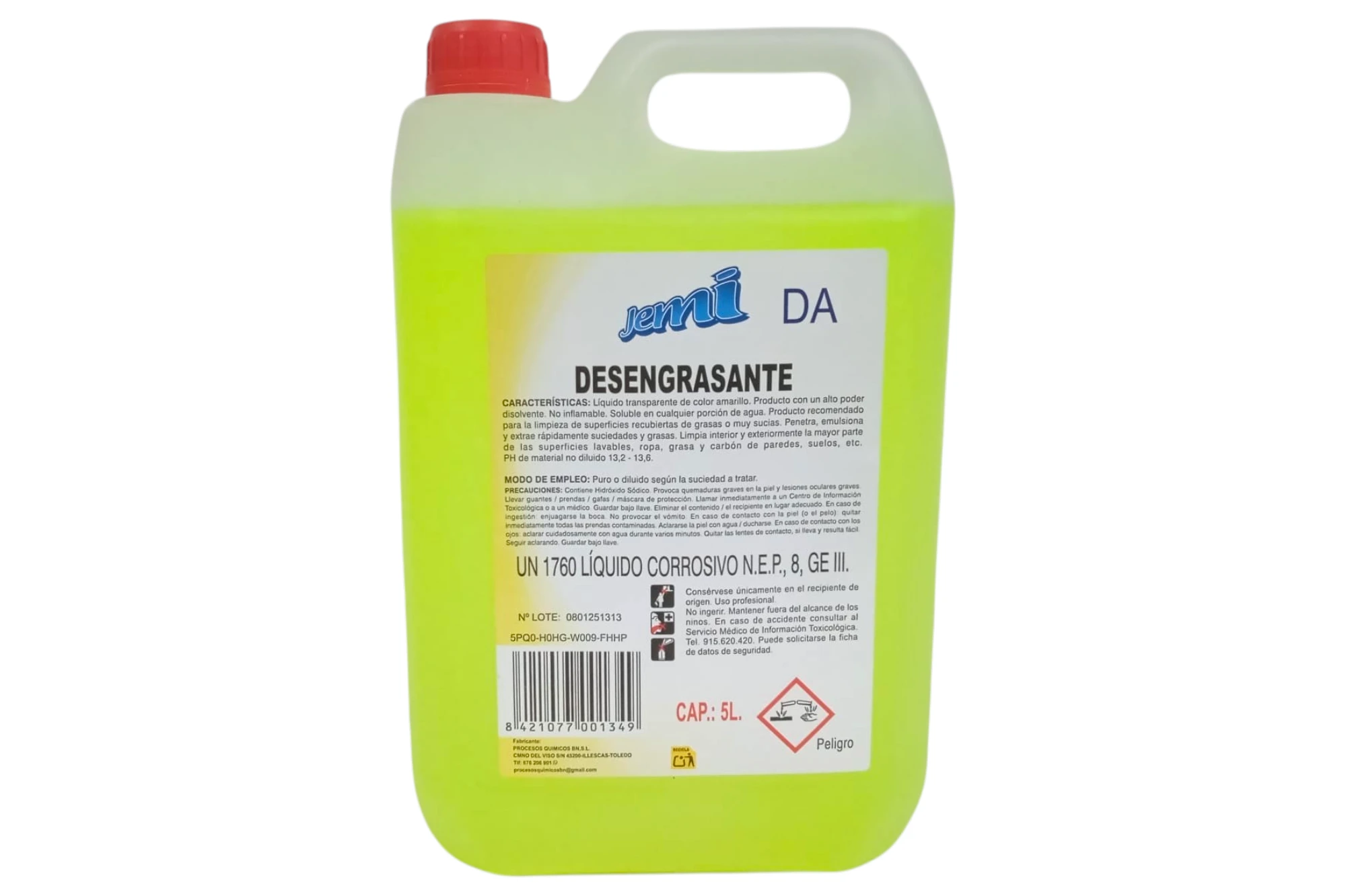 El desengrasante Jemi de 5 litros es un limpiador multiusos de alta concentración, diseñado para eliminar grasa pesada en cocinas, motores y superficies industriales. Se aplica puro para suciedad extrema o diluido en agua para limpieza diaria.