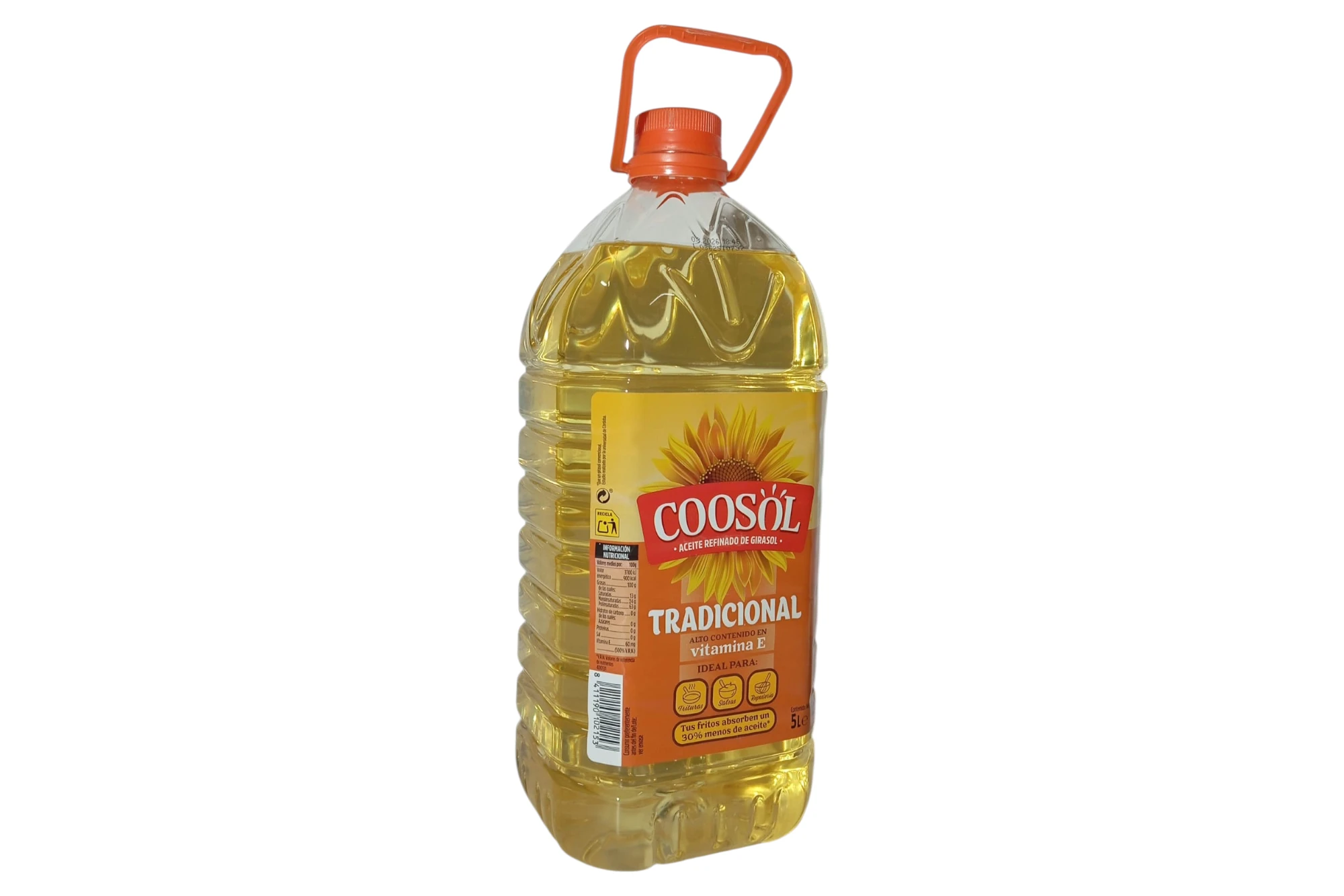 Aceite de girasol Coosol en formato de 5 litros, ideal por su estabilidad y rendimiento en cocina. Ofrece un sabor neutro perfecto para obtener frituras crujientes y elaborar repostería.