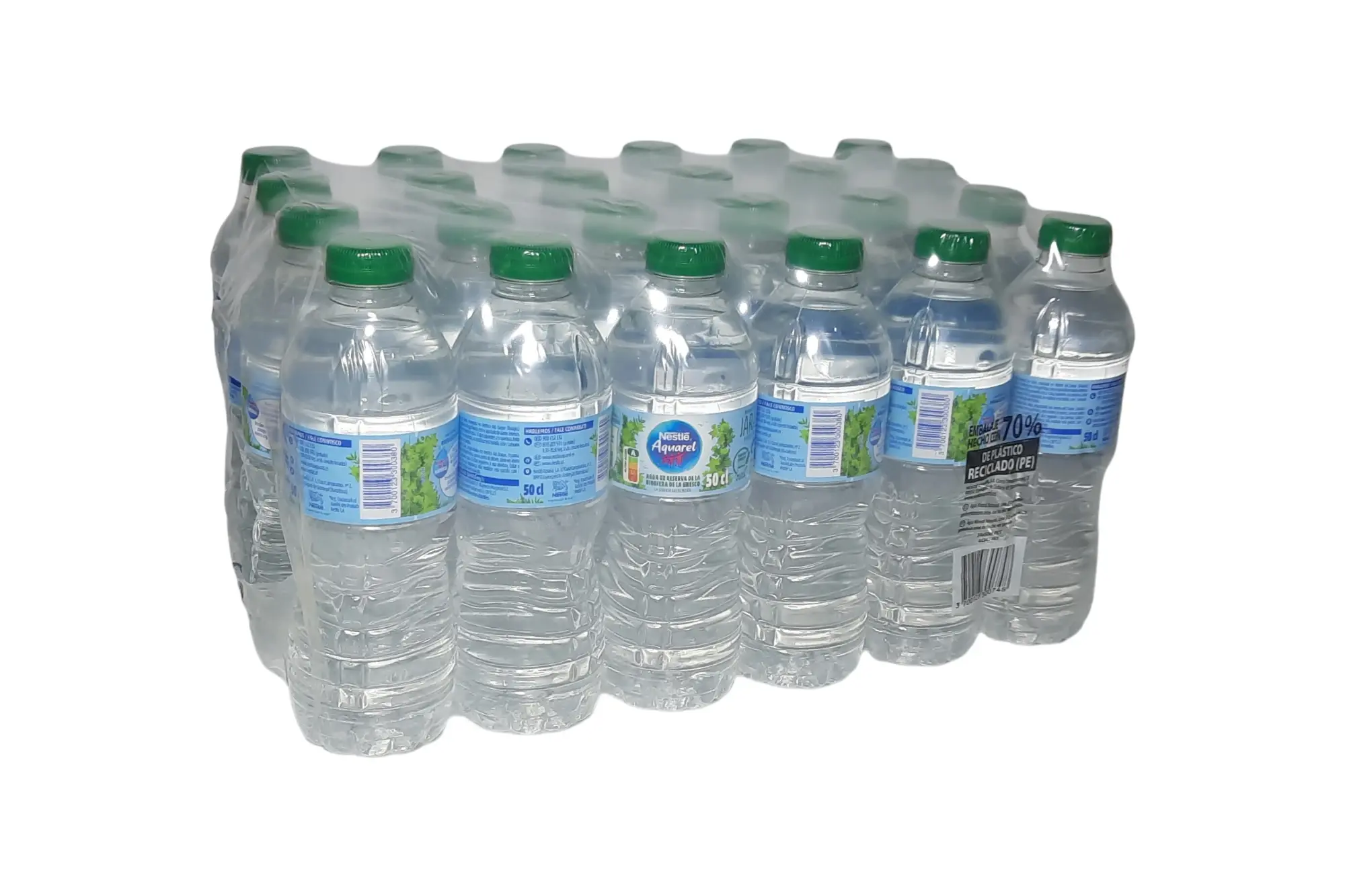 Caja de 24 botellas de agua Nestlé Aquarel de 50 cl. Es el formato ideal para eventos o para llevar, ofreciendo un agua de mineralización equilibrada y sabor puro en un envase cómodo.