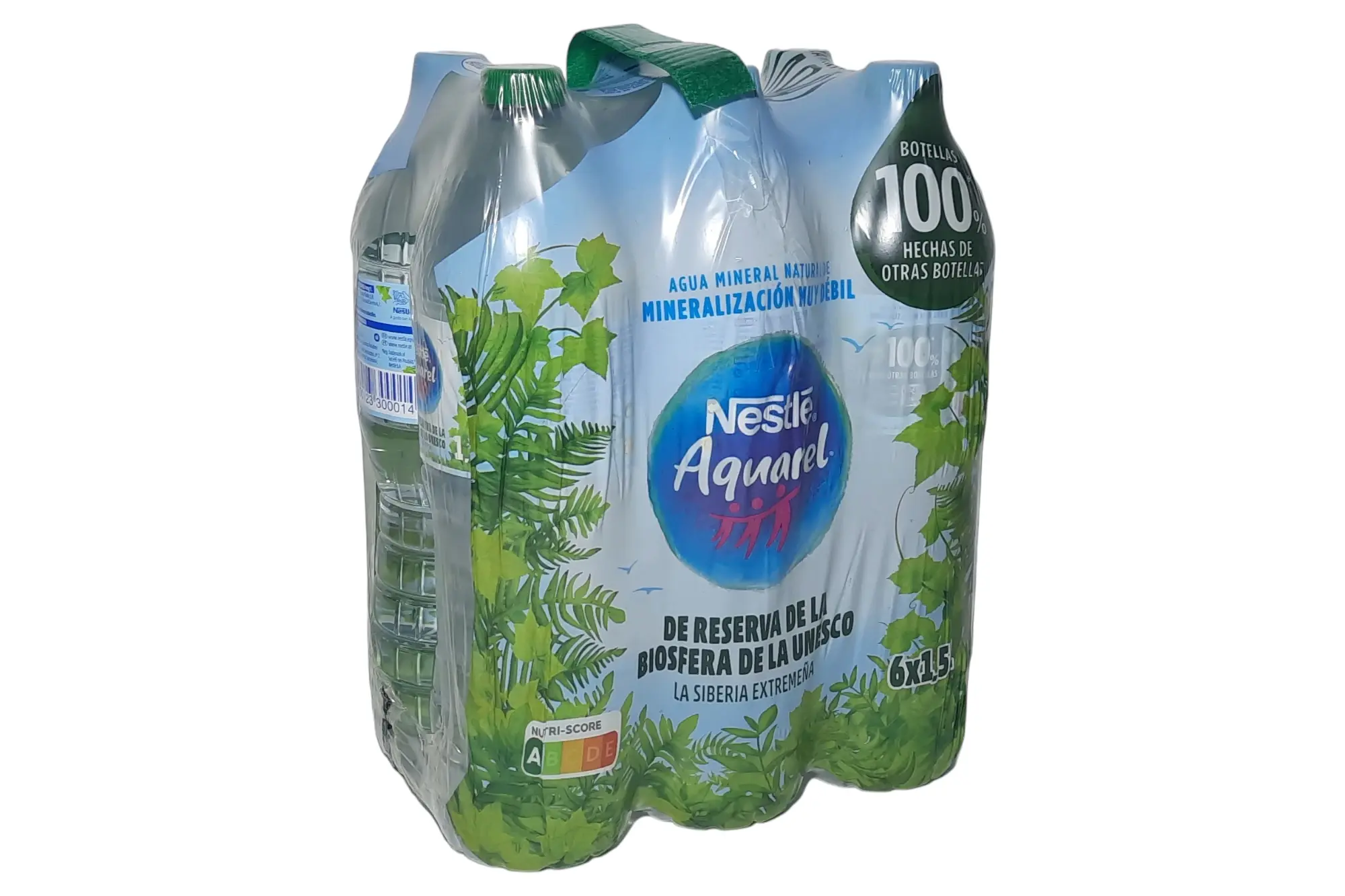 Pack de 6 botellas de agua mineral Nestlé Aquarel de 1,5 litros. Proviene de manantiales protegidos, ofreciendo un sabor puro y una mineralización equilibrada ideal para toda la familia.