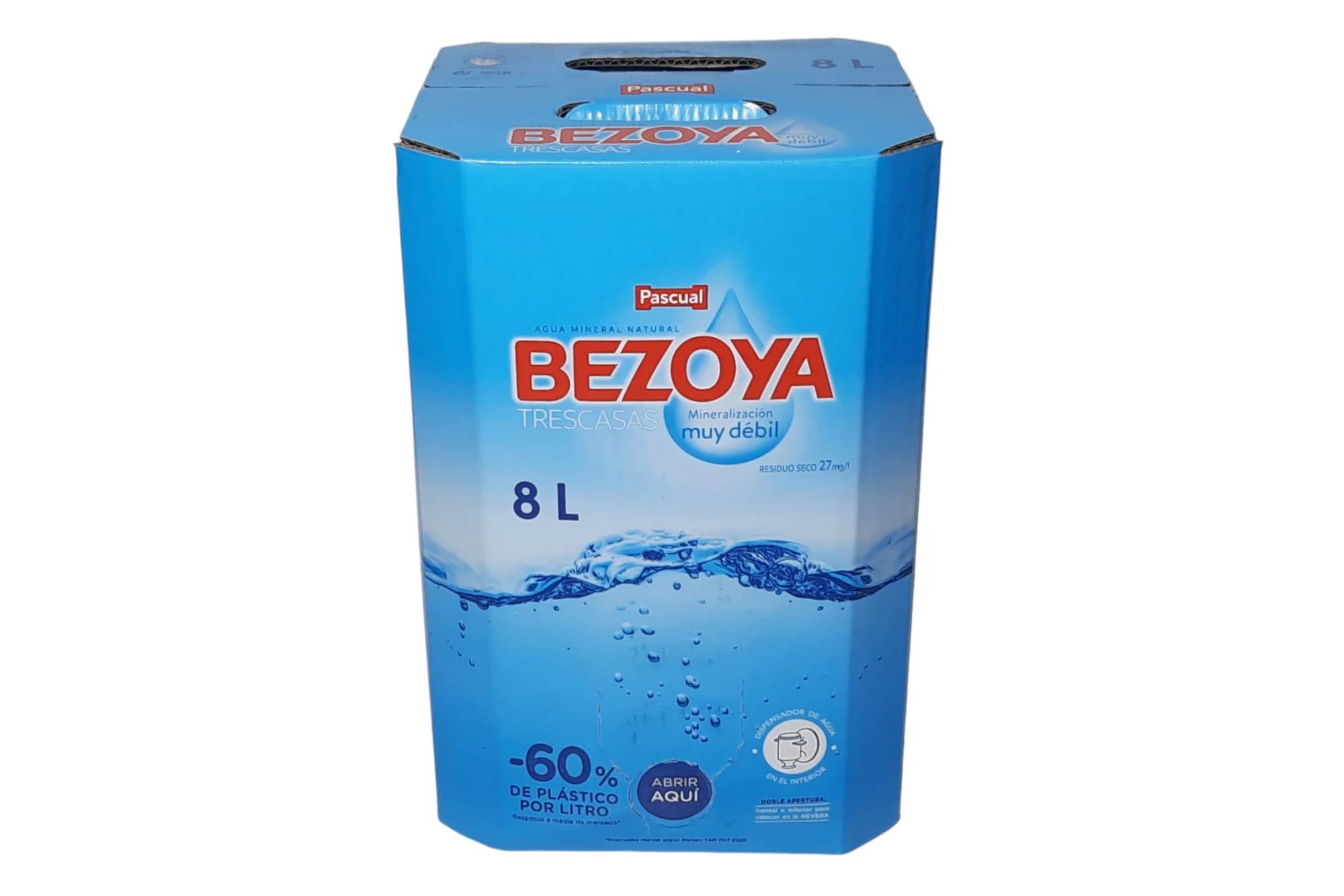 Agua Bezoya en Bag in Box de 8 litros. Envase sostenible con grifo dispensador, que mantiene intacta su mineralización muy débil y bajo residuo seco.