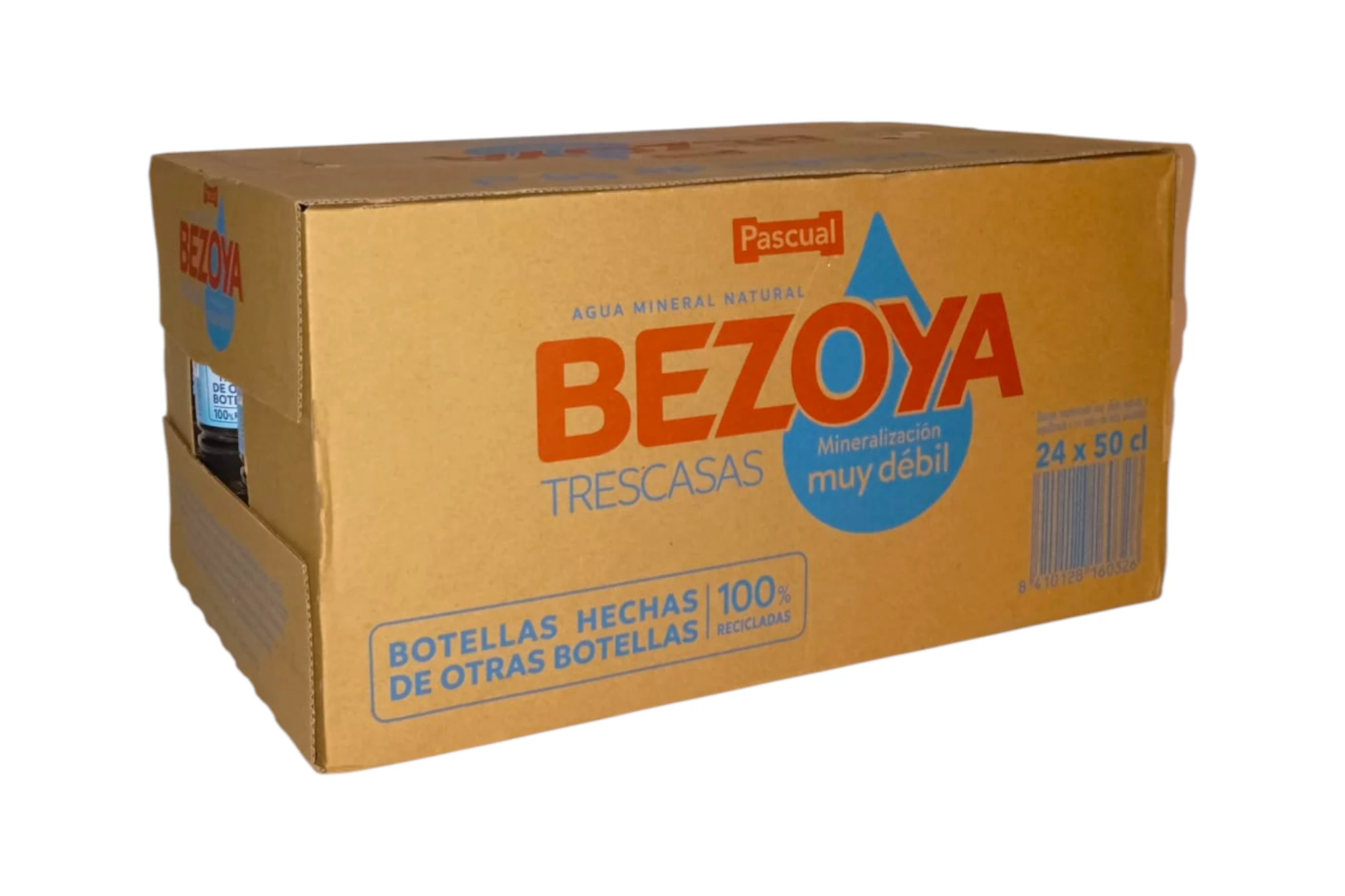 Caja de 24 botellas de agua mineral Bezoya de 0,5 litros. Es un agua de mineralización muy débil y residuo seco extremadamente bajo, presentada en un formato práctico para el consumo individual y fuera de casa.