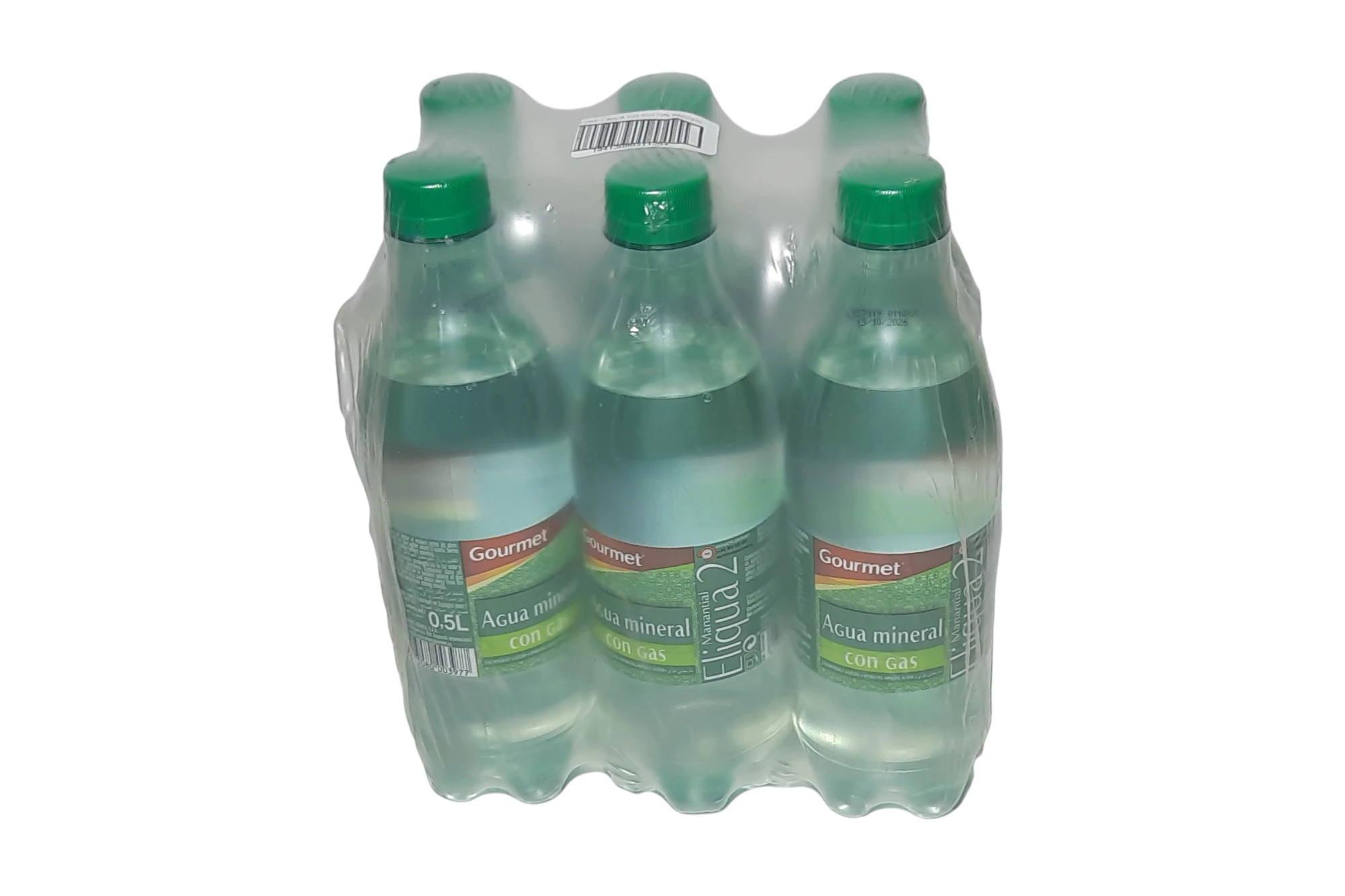 Pack de 6 botellas de agua con gas Gourmet de 0,5 litros. Agua mineral carbonatada con burbuja equilibrada, ideal para acompañar comidas y refrescar de forma ligera.