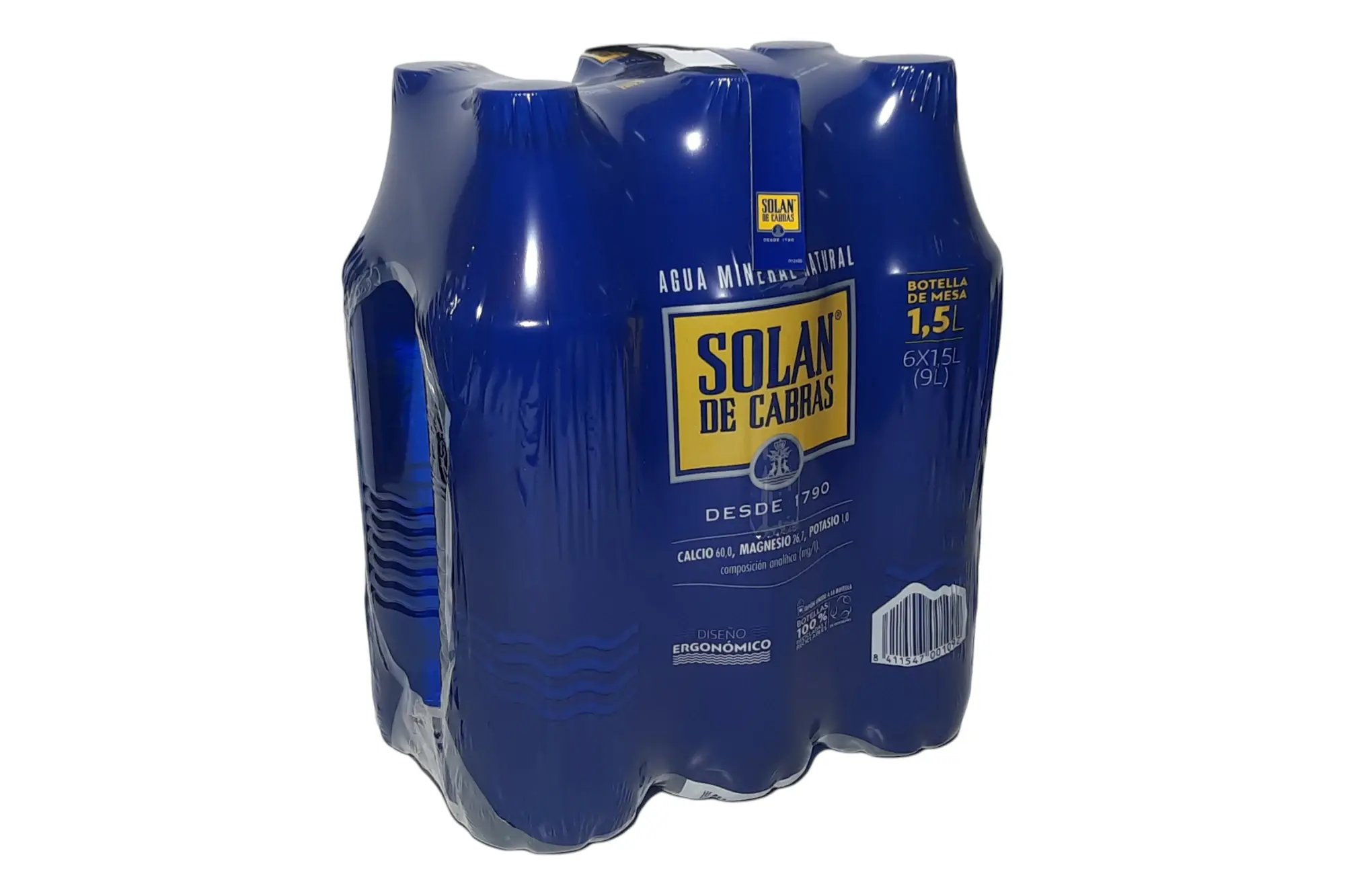 Pack de 6 botellas de agua Solán de Cabras de 1,5 litros. Agua mineral natural de mineralización débil y pureza constante, ideal para el consumo familiar diario.