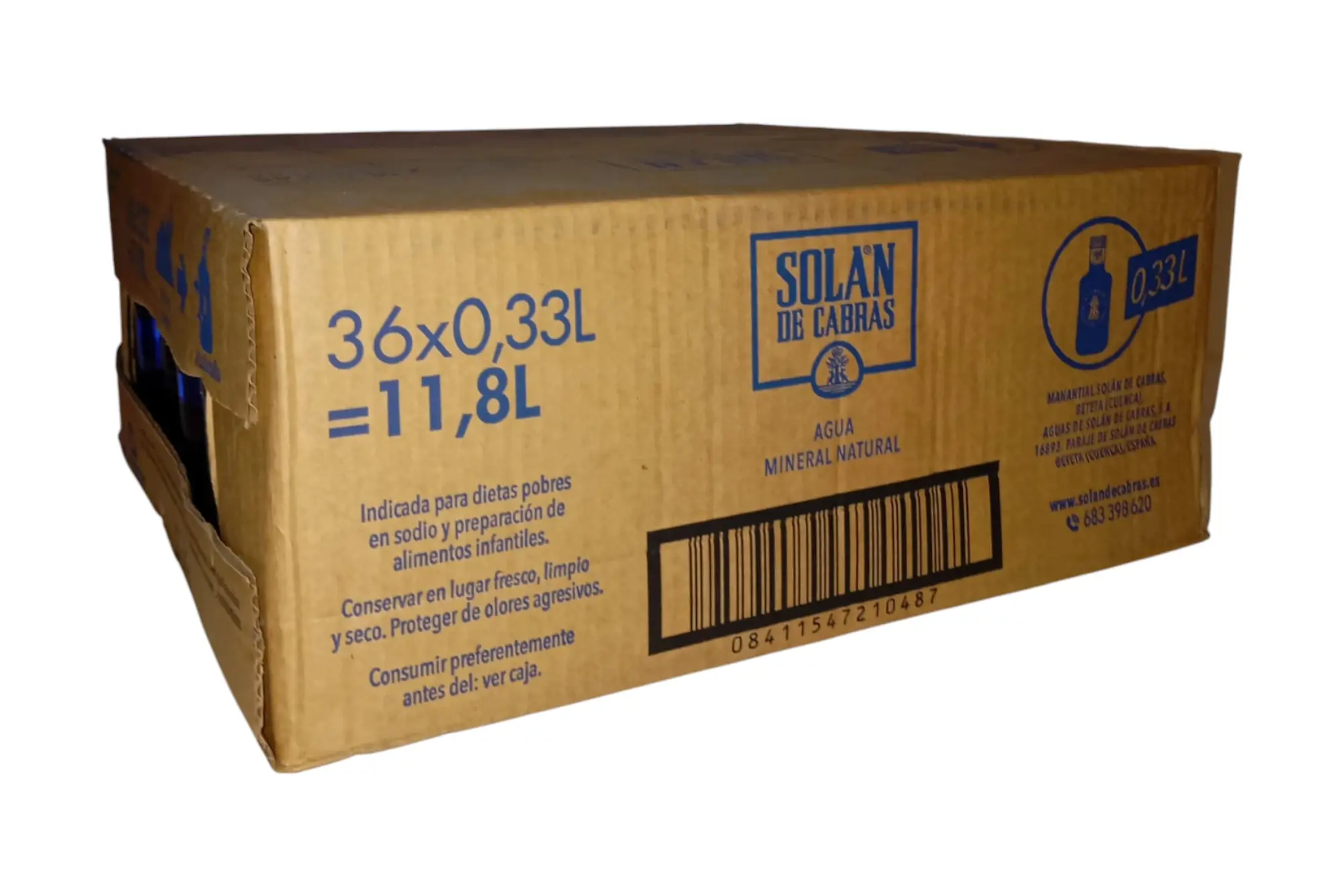 Caja de 36 botellas de agua Solán de Cabras de 0,33 litros. Agua mineral natural de mineralización débil y pureza óptima, en un formato pequeño y manejable para un consumo rápido.