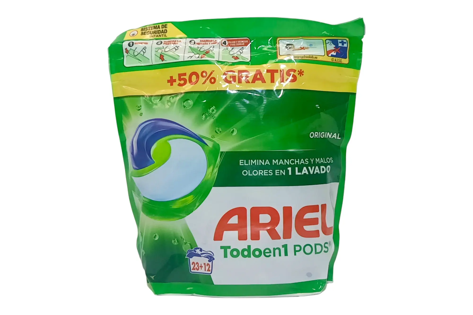 Envase de detergente Ariel en cápsulas monodosis. Un sistema de limpieza avanzada que combina ingredientes activos para eliminar manchas difíciles, iluminar la ropa y proteger los tejidos, ofreciendo una dosificación exacta y resultados impecables incluso en lavados con agua fría.