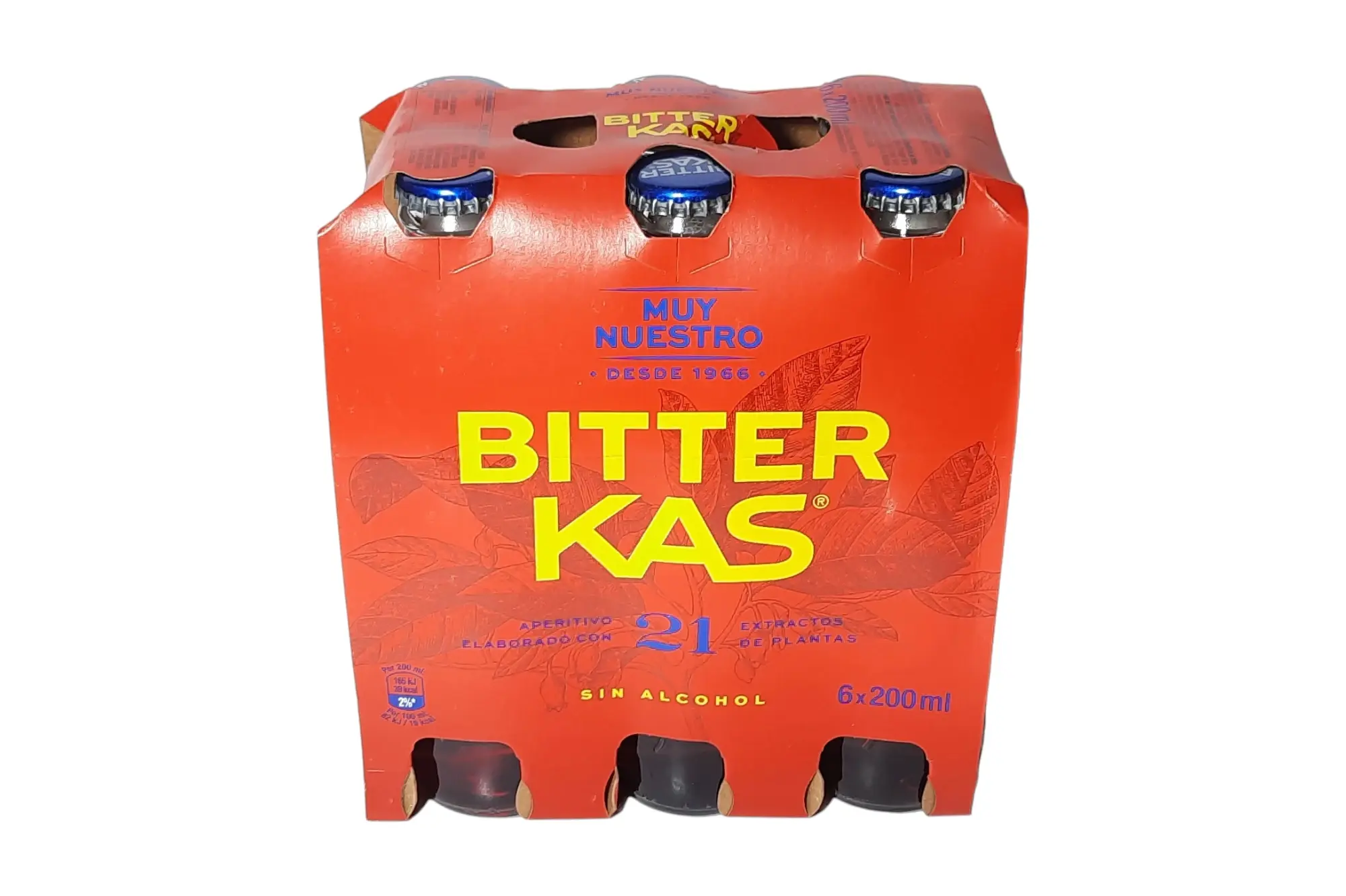 Pack de 6 botellas de Bitter Kas. Bebida refrescante de extractos herbales con su característico color rojo y sabor amargo con toques cítricos, ideal para el aperitivo