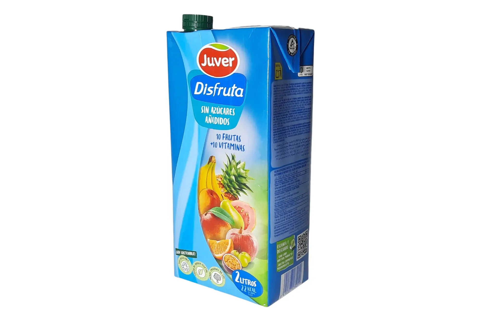 Juver Disfruta (2 Litros) Es un zumo multifrutas en formato familiar de gran ahorro, elaborado sin azúcares añadidos. Combina una amplia selección de 10 frutas (como piña, manzana, uva, melocotón y cítricos) para ofrecer un sabor complejo y completo. Es muy bajo en calorías, no tiene pulpa y está enriquecido con vitaminas, siendo una opción ideal para el consumo diario en casa.