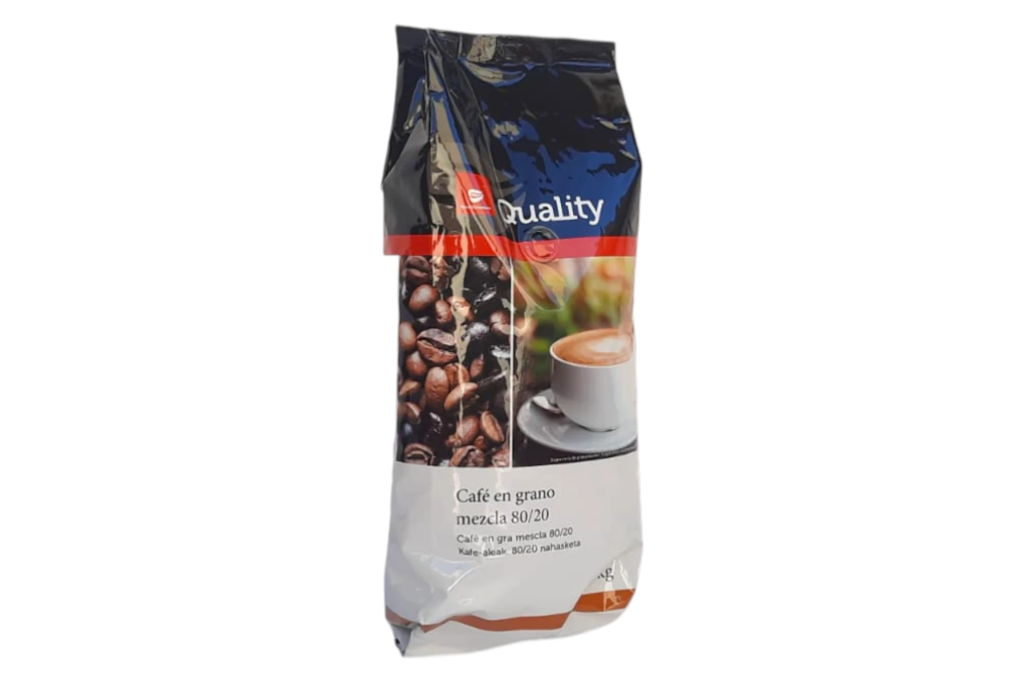 Paquete de 1 kg de café Quality 80/20 en grano. Una mezcla equilibrada que combina un 80% de granos de tueste natural con un 20% de granos torrefactos, ofreciendo un sabor intenso y un aroma profundo.