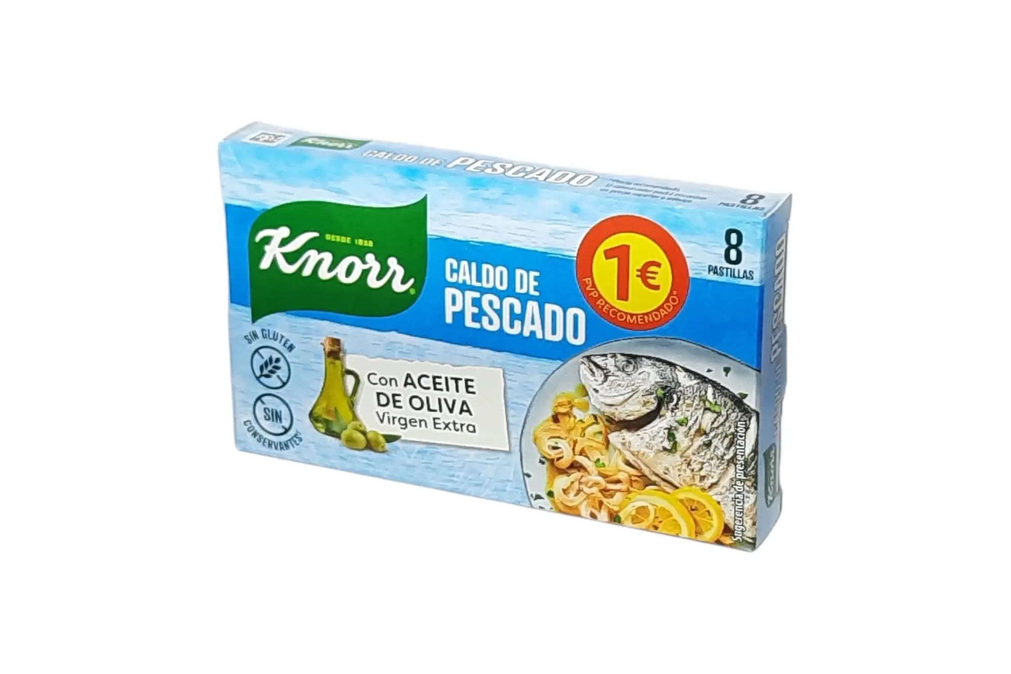 Caja de caldo de pescado Knorr. Pastillas de caldo concentrado elaboradas con una combinación de pescados y especias que realzan el sabor de tus recetas, aportando un toque marinero equilibrado a sopas, paellas y guisos