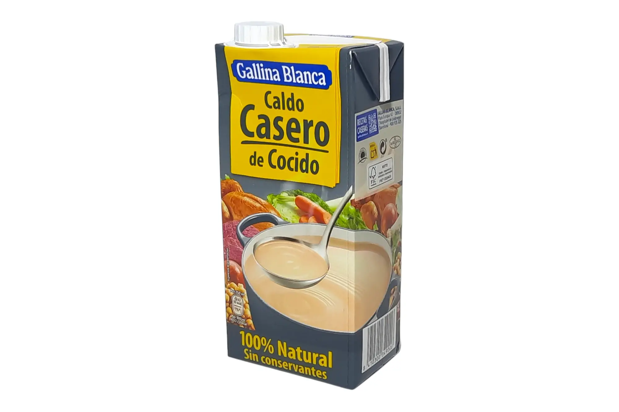 Brik de 1 litro de caldo de cocido Gallina Blanca. Preparado de forma tradicional con ingredientes 100% naturales como carne de vacuno, garbanzos y verduras frescas, cocinados a fuego lento durante horas para ofrecer un sabor casero y reconfortante.