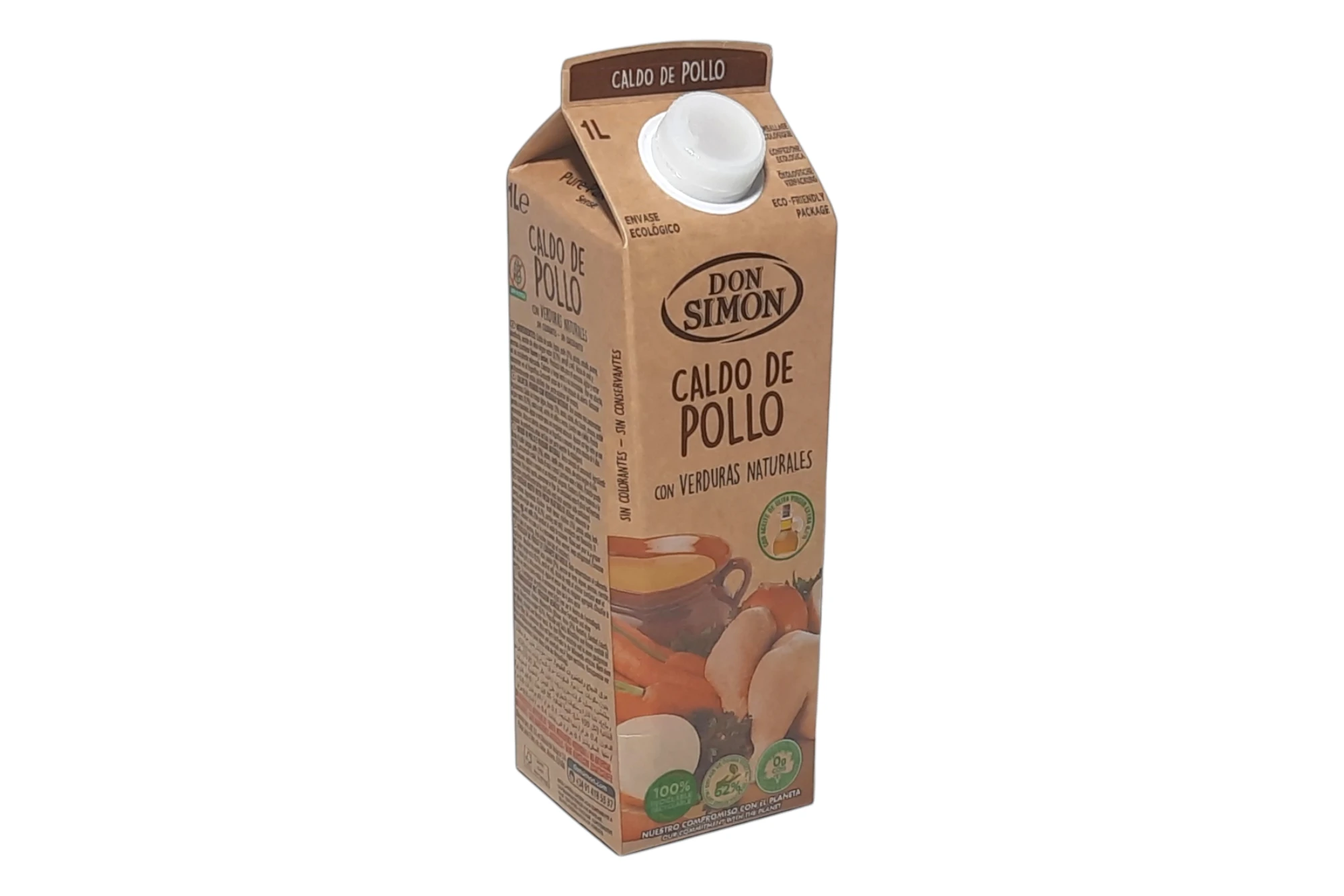 Brik de 1 litro de caldo de pollo Don Simón. Elaborado con ingredientes seleccionados y pollo de corral, este caldo listo para servir ofrece un sabor suave y natural, ideal para preparar sopas rápidamente o como base para enriquecer tus guisos
