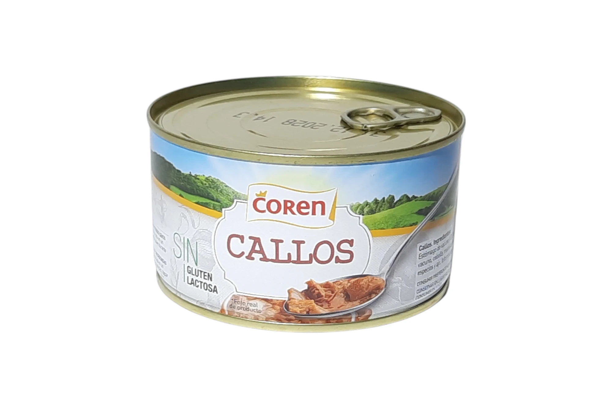 Lata de 350 g de Callos Louriño (Coren). Una receta tradicional gallega preparada con ingredientes seleccionados, que incluye callos de vacuno, un toque de chorizo y jamón en una salsa sabrosa. Es un plato listo para calentar y servir.