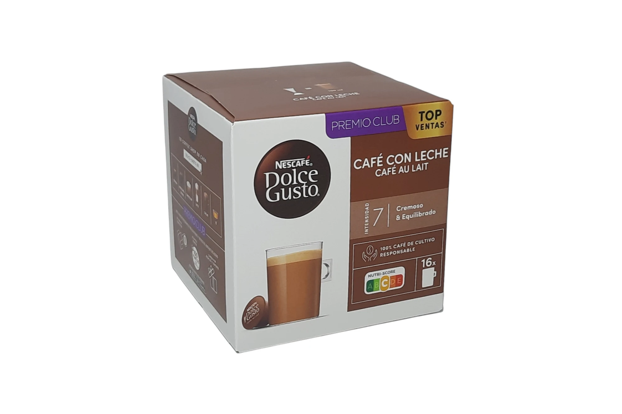 Caja de cápsulas de café con leche para sistema Dolce Gusto. Una combinación equilibrada de café de cuerpo intenso y leche cremosa en una sola cápsula, ideal para preparar una taza suave y deliciosa con su característica capa de espuma.