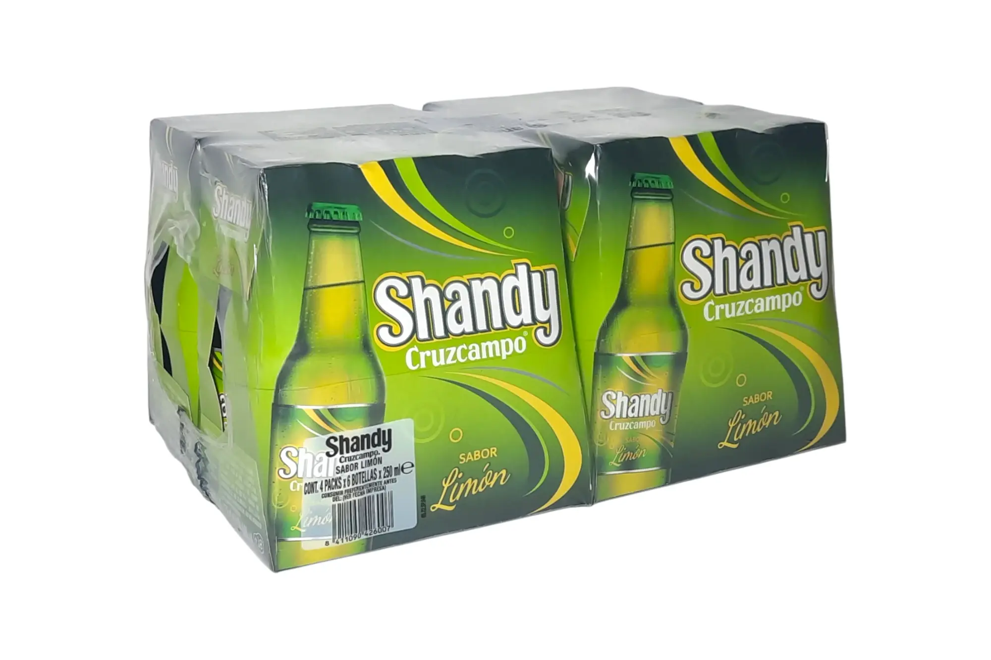 Botella de 25 cl de cerveza Cruzcampo Shandy. Bebida refrescante con un toque de limón y muy baja graduación alcohólica, presentada en formato de vidrio para mantener su ligereza y sabor cítrico ideal para disfrutar en cualquier momento.