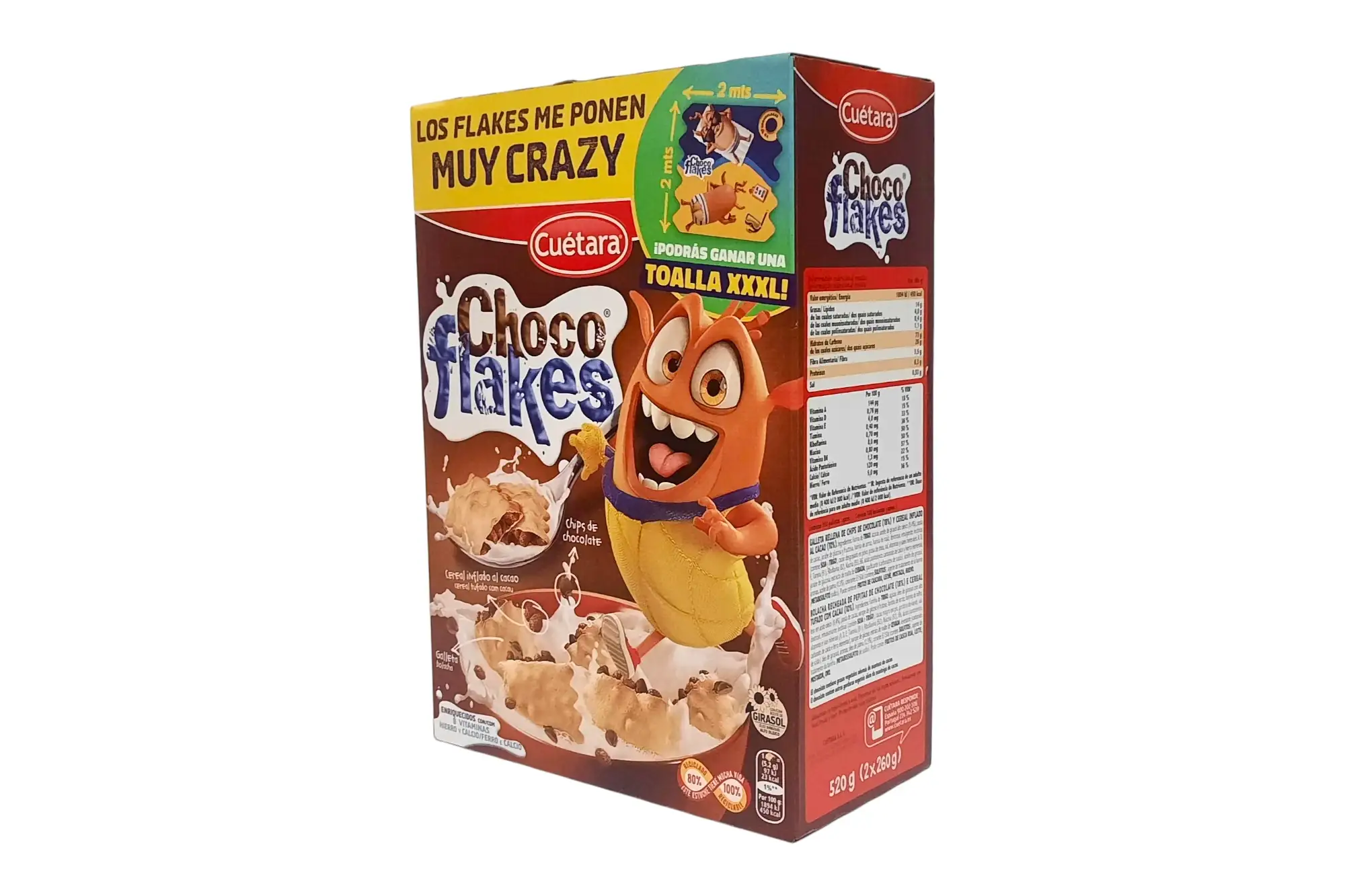 Bolsa de cereales Choco Flakes de Cuétara. Divertidos y crujientes bocaditos de cereales rellenos de chips de chocolate y arroz inflado, diseñados para aguantar crujientes en la leche y ofrecer un sabor intenso a chocolate en cada cucharada.