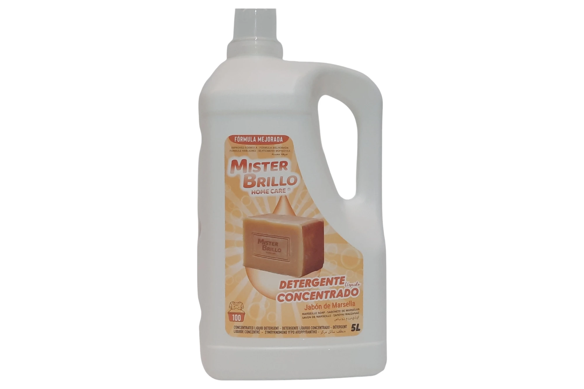 Botella de detergente líquido Mister Brillo. Jabón diseñado para la limpieza de la ropa que combina un alto poder desengrasante con una fórmula que realza la luminosidad de las prendas, proporcionando un acabado impecable y un aroma fresco
