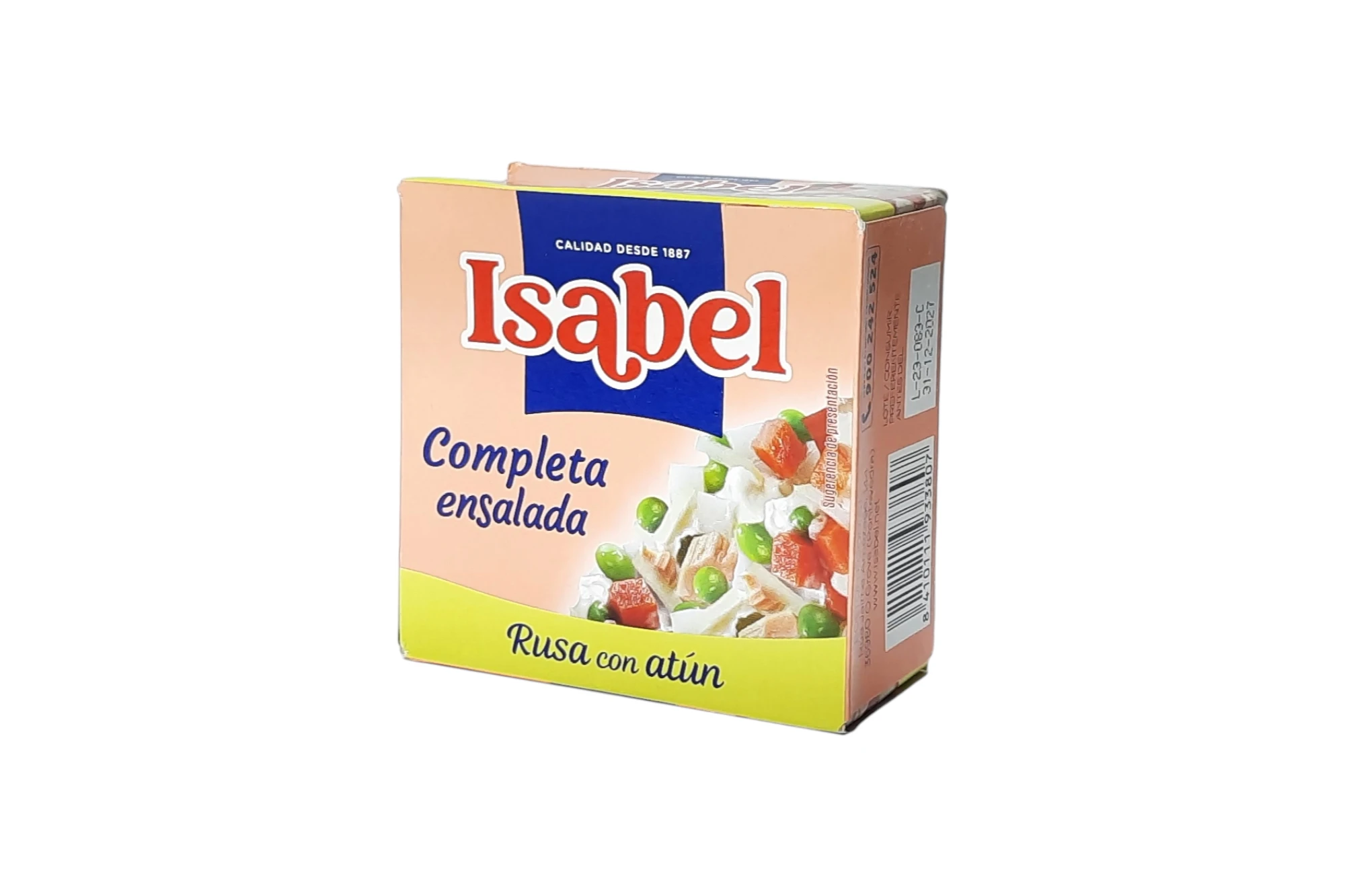 Ensalada Rusa Isabel : Receta clásica de patata, atún, guisantes y zanahoria con una base de mayonesa suave. Viene en bol listo para consumir, ideal como comida rápida o picoteo.