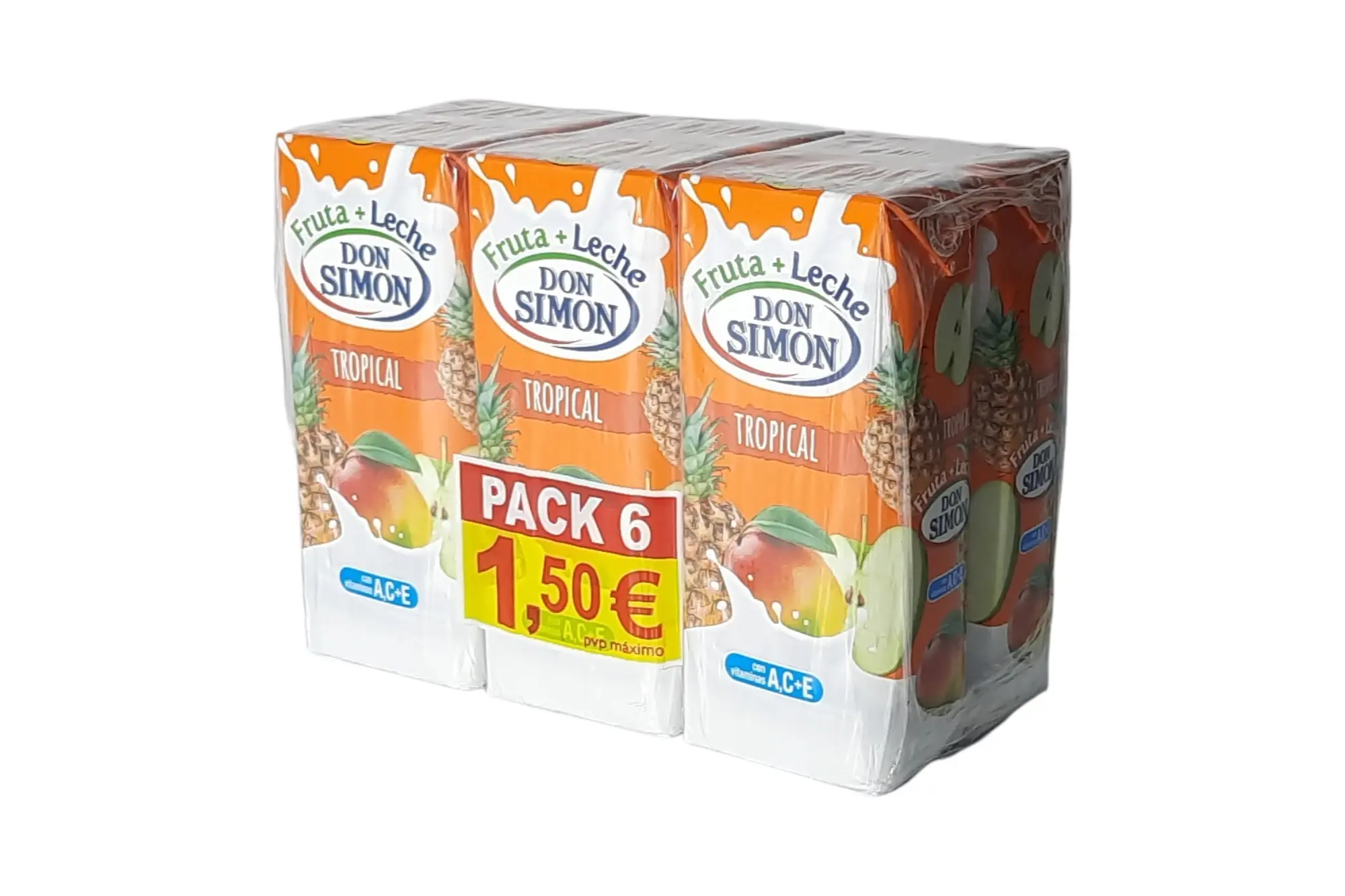 Don Simón Funciona con su gama (Fruta + Leche) Es la combinación clásica de leche desnatada con zumos. Es una bebida ligera, con 0% materia grasa y enriquecida con vitaminas A, C y E. Ofrece un sabor dulce y exótico muy suave, pero con el equilibrio justo para ser refrescante sin resultar pesado.