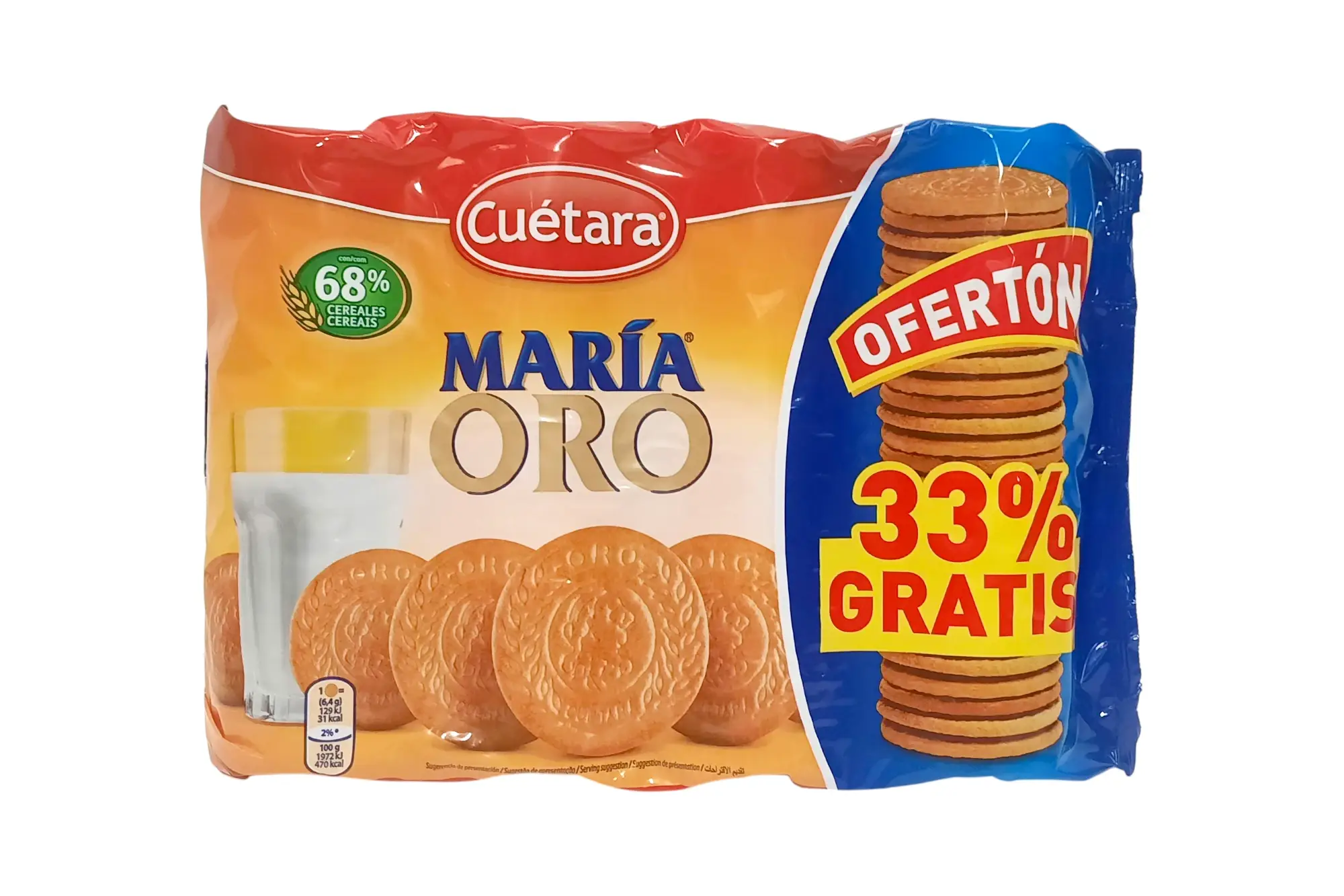 Paquete de galletas María Oro de Cuétara. Una versión premium de la clásica María, más tostada, crujiente y con un sabor más intenso. Su textura reforzada la hace especialmente resistente al mojarla en leche