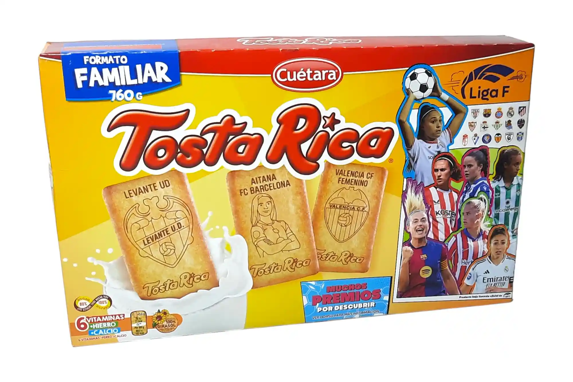 Paquete de galletas Tosta Rica de Cuétara. Las icónicas galletas con dibujos infantiles, ricas en hierro, calcio y vitaminas. Perfectas para el desayuno por su textura crujiente y su sabor suave