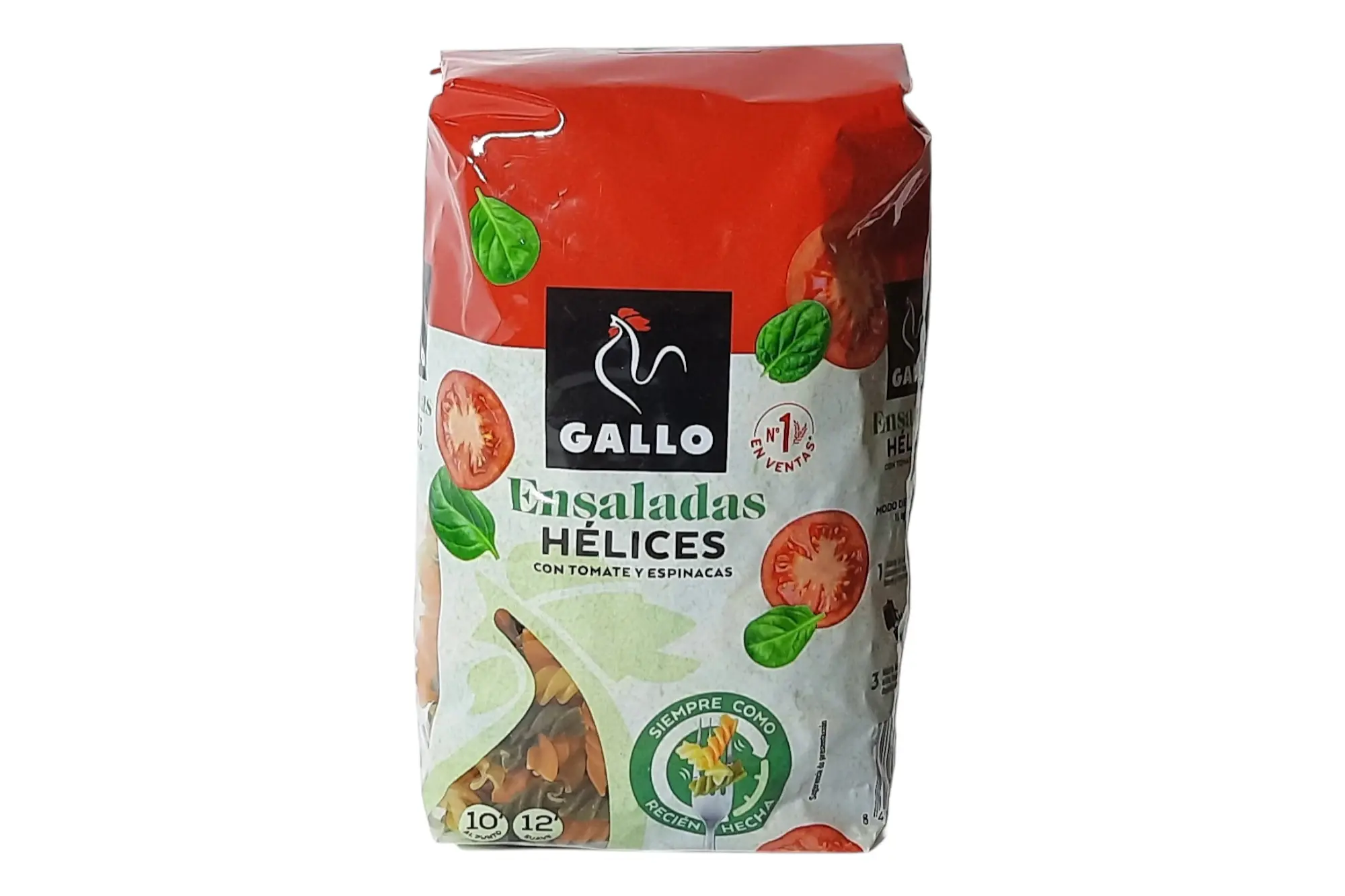 Paquete de 450 g de pasta Gallo espirales (hélices). Pasta de sémola de trigo duro de alta calidad, perfecta para ensaladas o para acompañar con salsas espesas gracias a su forma que atrapa bien los ingredientes.