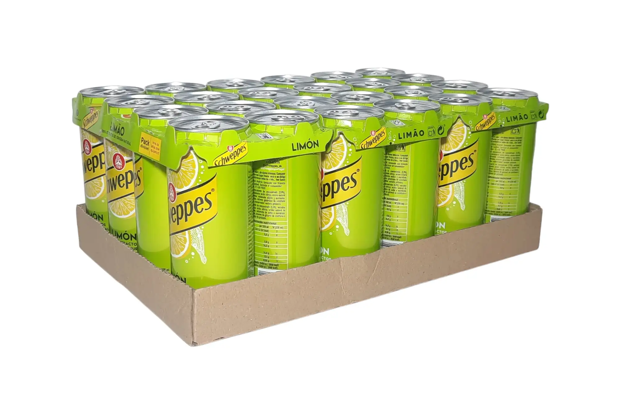 Lata de limón Schweppes. Bebida refrescante con extractos de limones seleccionados, con un sabor cítrico equilibrado y el toque de burbuja fina característico de Schweppes.