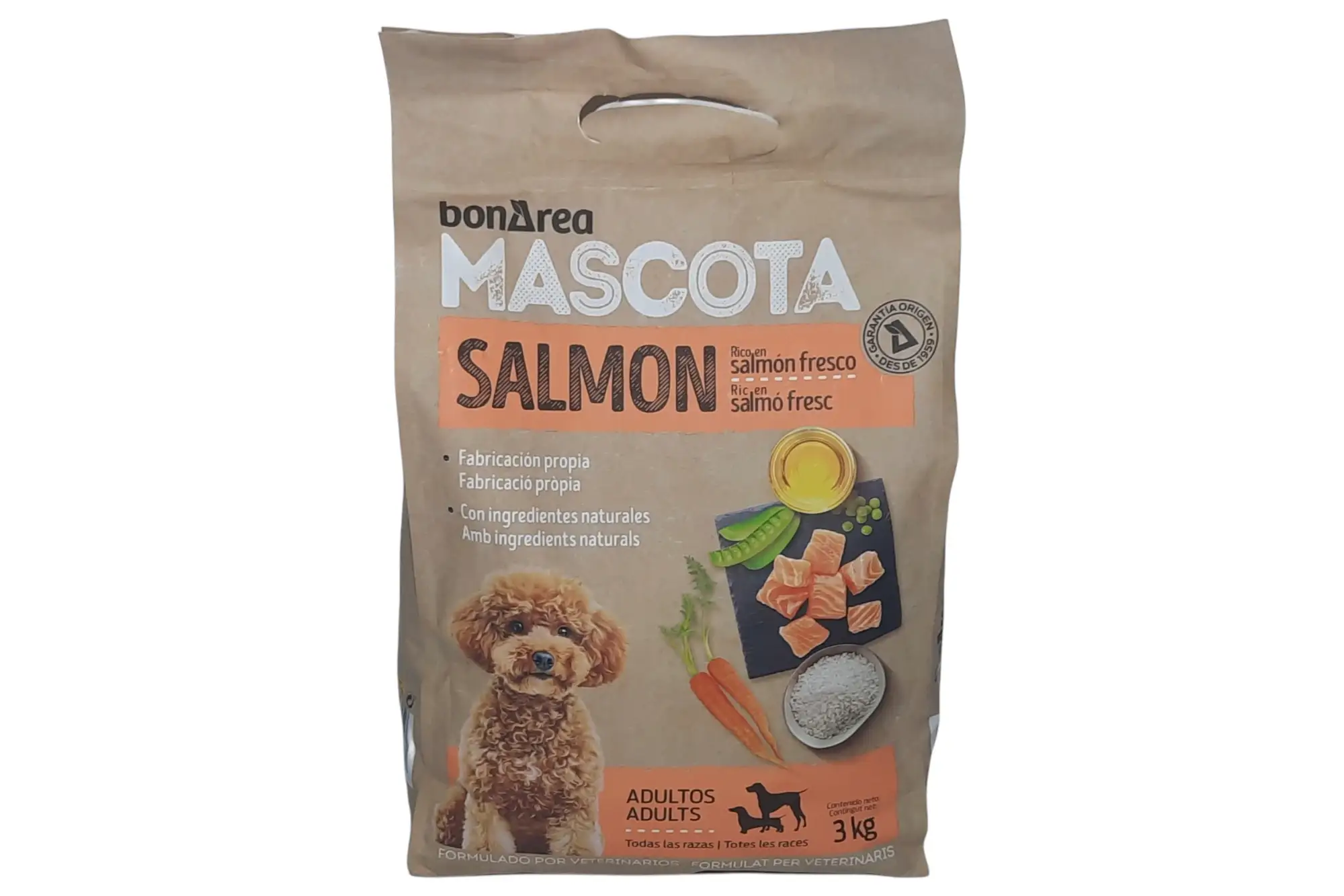 Saco de 3 kg de pienso bonArea Salmón. Una alimentación de alta gama, formulada con ingredientes seleccionados para ofrecer una nutrición óptima, completa y equilibrada para perros con un nivel de actividad normal.