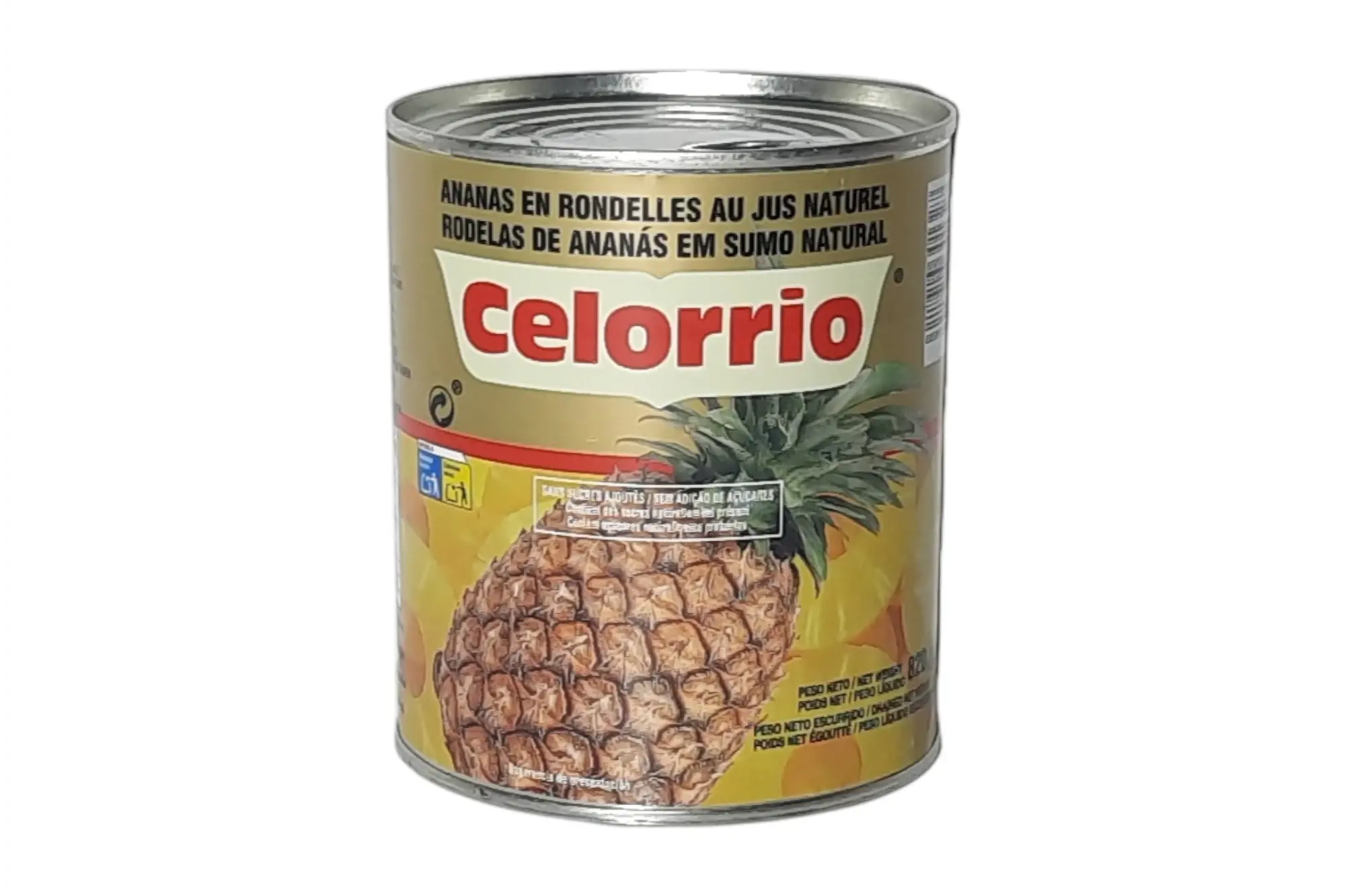 Piña en su jugo Celorrio (800g): Rodajas de piña seleccionadas y conservadas en su propio jugo natural, sin azúcares añadidos. Una opción refrescante, ligera y saludable, ideal para postres o ensaladas.