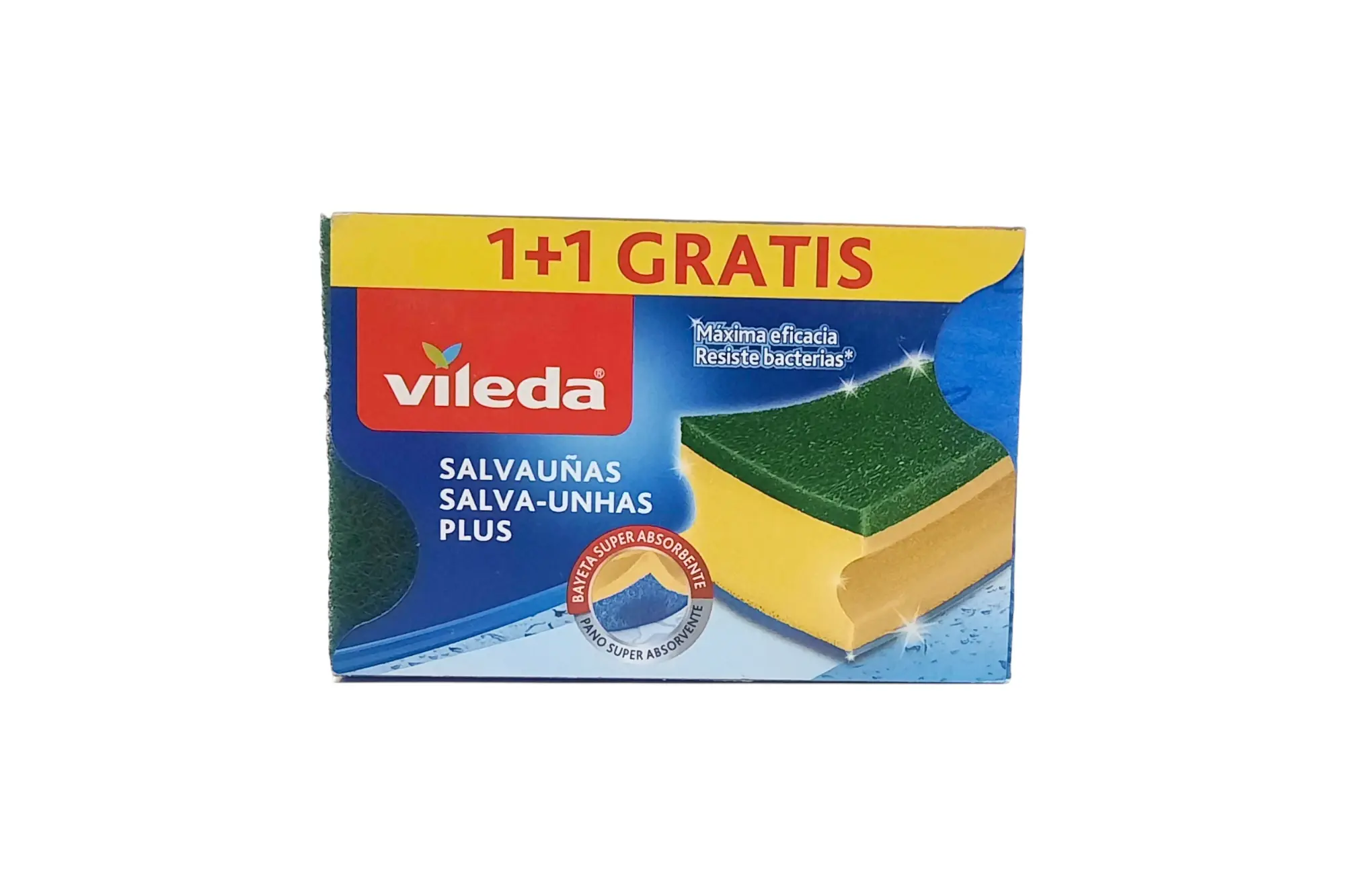 Estropajo Salvauñas Vileda (Pack 3) Pack de dos estropajos con diseño ergonómico que protege las uñas y manos durante el uso. Su cara abrasiva elimina la suciedad difícil, mientras que la esponja absorbe y cuida las superficies.