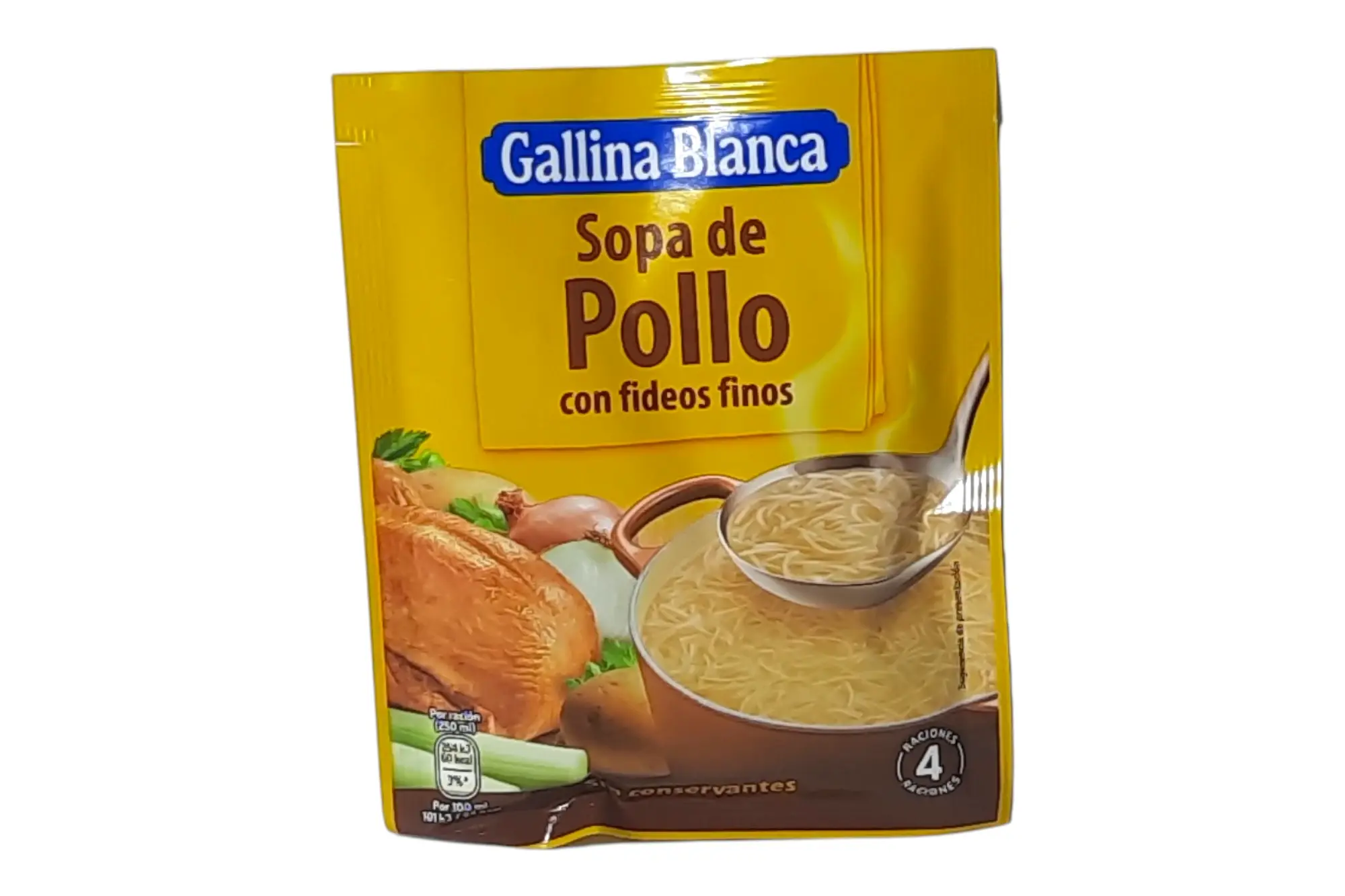 Sobre de sopa de pollo con fideos de Gallina Blanca. Una solución práctica y sabrosa elaborada con ingredientes seleccionados para obtener un caldo reconfortante con el toque justo de sabor a hogar en pocos minutos.