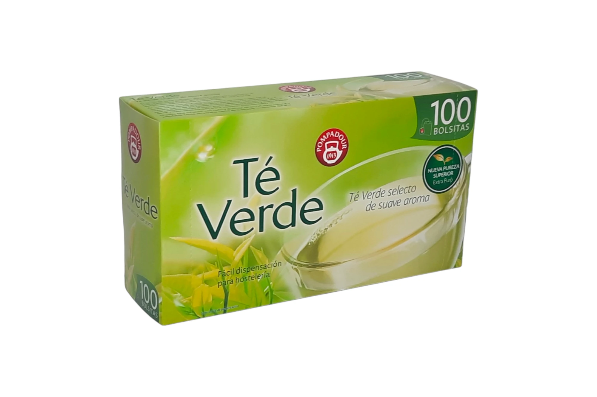 Caja de 100 unidades de té verde Pompadour. Infusión de alta calidad en bolsitas individuales elaborada con hojas seleccionadas para ofrecer un sabor suave y natural, destacando por su alto contenido en antioxidantes y sus propiedades revitalizantes