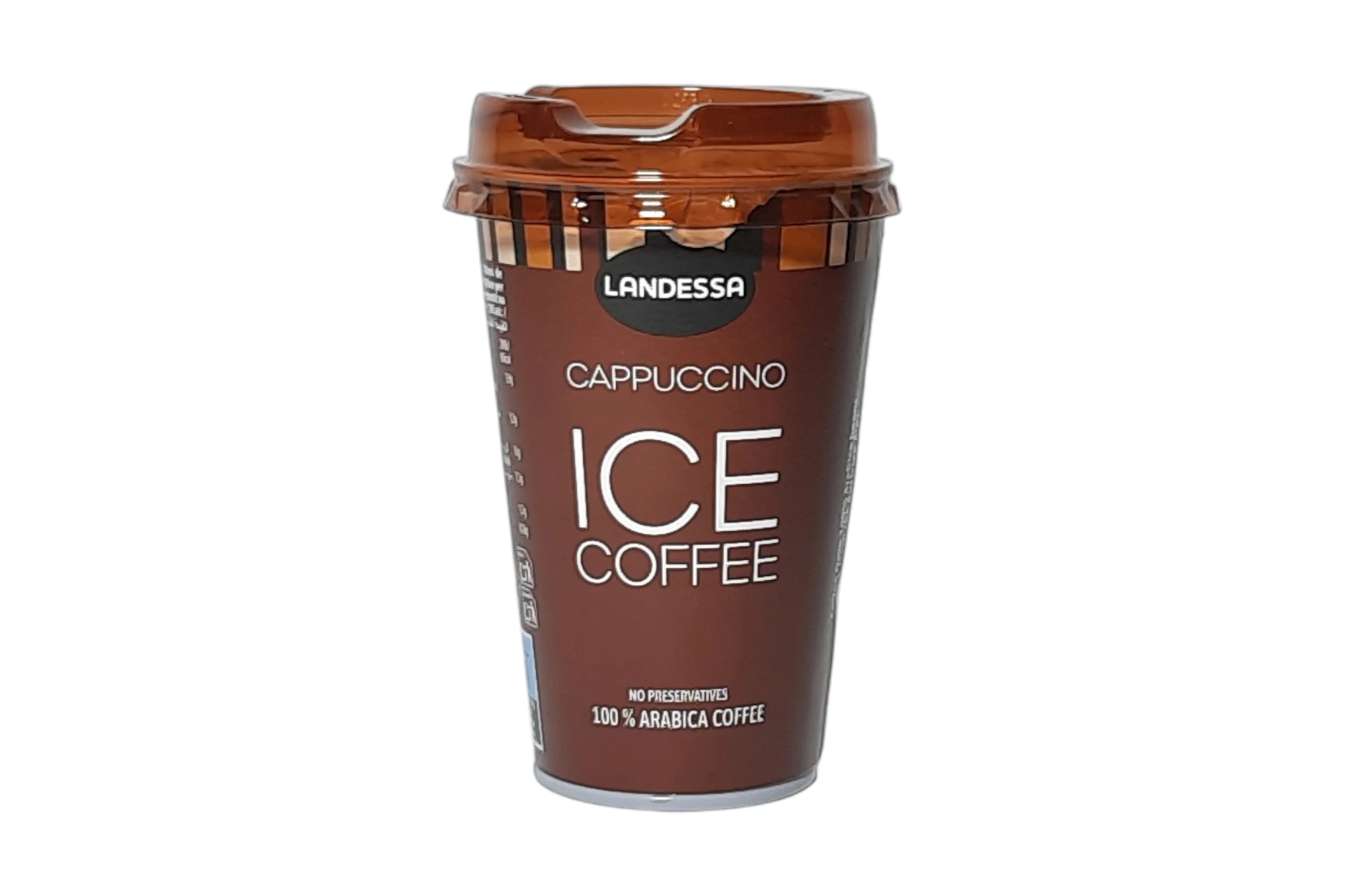 Vaso de 23 cL de Landessa Ice Coffee Cappuccino. Bebida de café frío elaborada con leche de los Alpes y granos de café Arábica de alta calidad, ofreciendo un sabor cremoso y refrescante con el toque clásico del cappuccino.